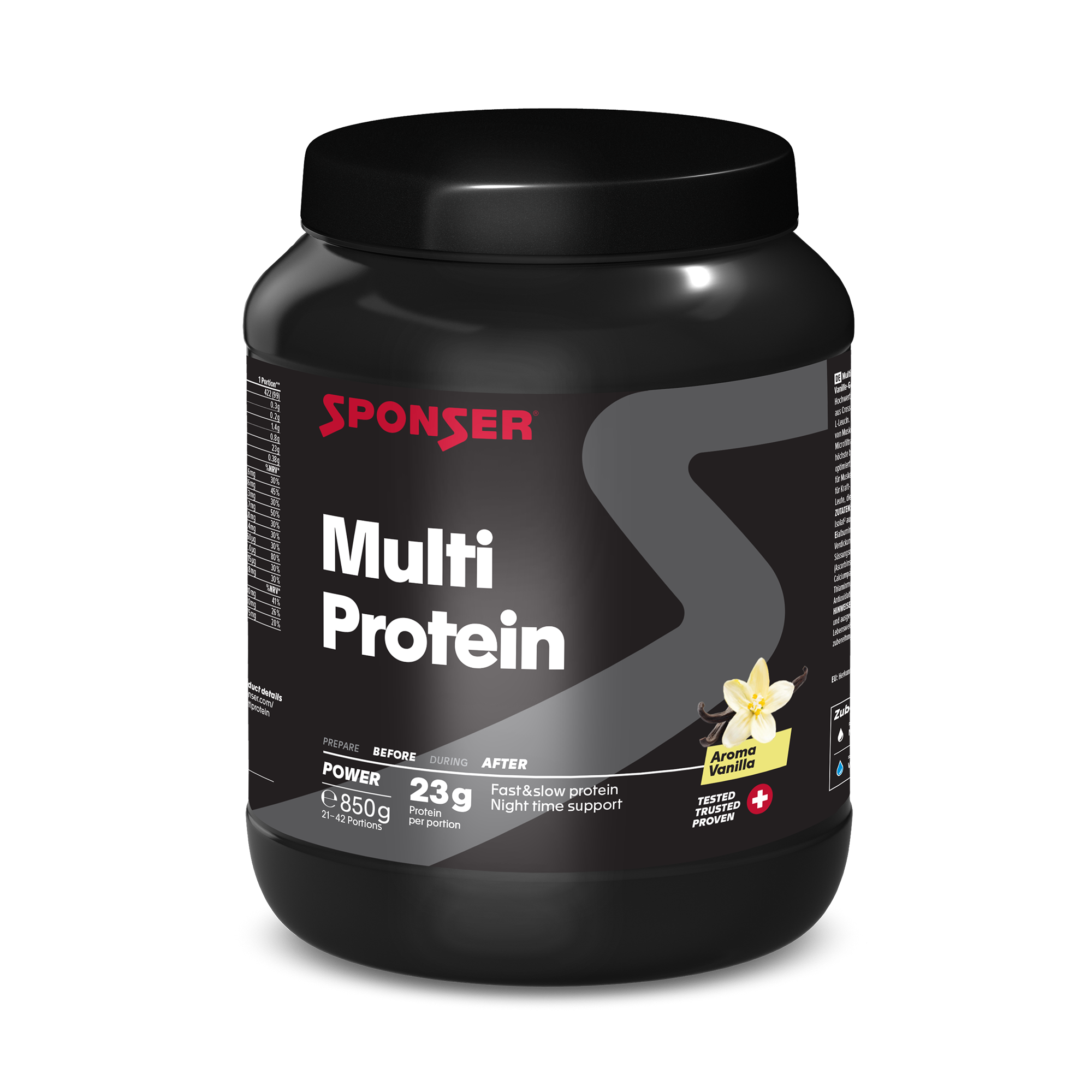 Multi Protein by SPONSER® is a multi-component protein consisting of high-quality milk protein, whey protein and egg albumin. Multi Protein is versatile due to the specific combination of the various protein sources, which are available both quickly and slowly: as a basic protein for covering daily protein requirements and for muscle building and recovery after sporting activities. Due to its slower digestion and thus long-lasting amino acid supply, Multi Protein is also ideally suited for maintaining muscle mass and as a satiating meal (supplement) to support diets.
