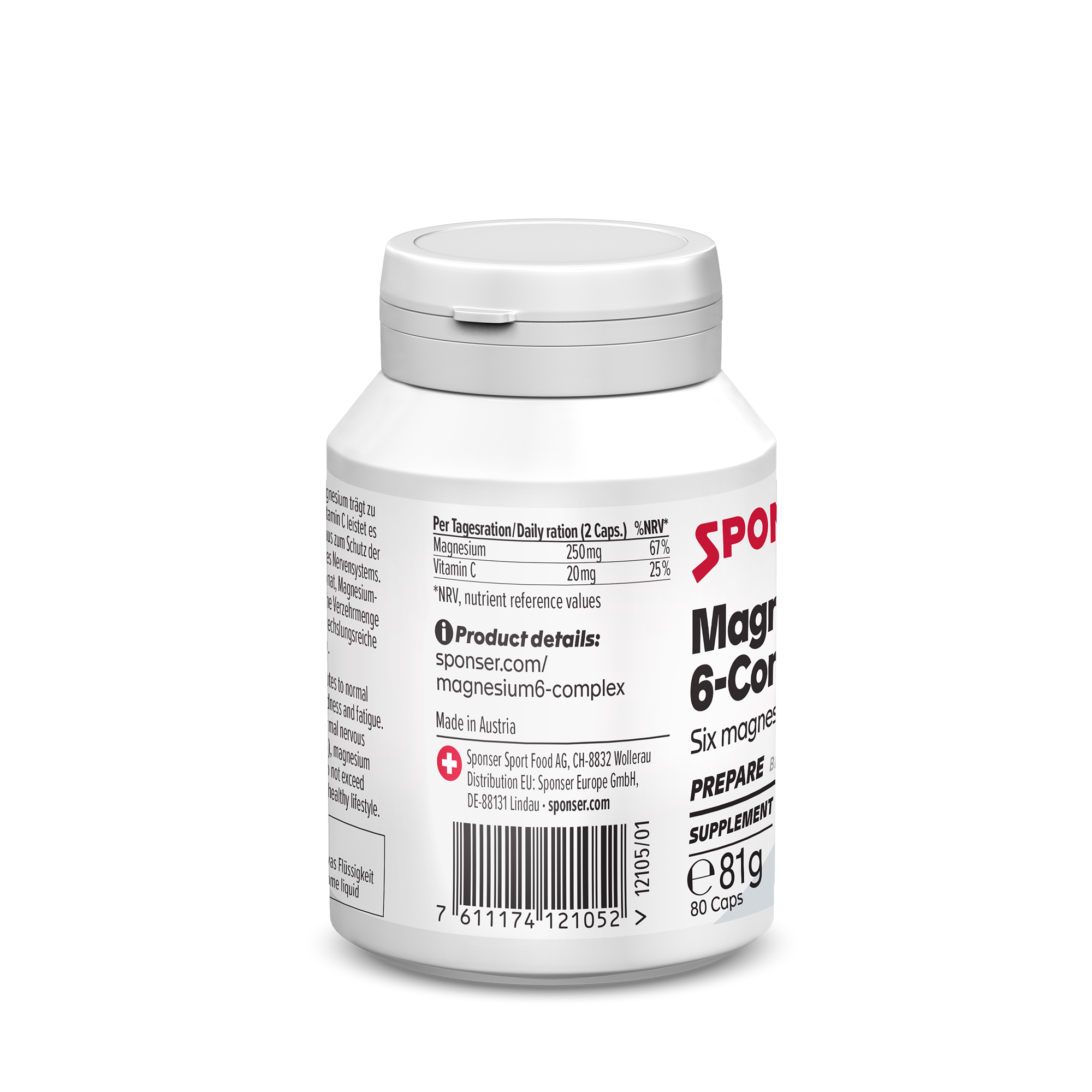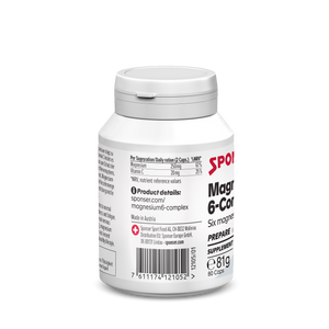 Magenesium 6-Complex de SPONSER® est un complément de magnésium de haute qualité sous forme de capsules, contenant 6 composés organiques de magnésium ainsi que de la vitamine C supplémentaire. Idéal pour toutes celles et ceux qui souhaitent couvrir leurs besoins quotidiens en magnésium – particulièrement en cas d’effort physique accru, de stress ou d’alimentation déséquilibrée.